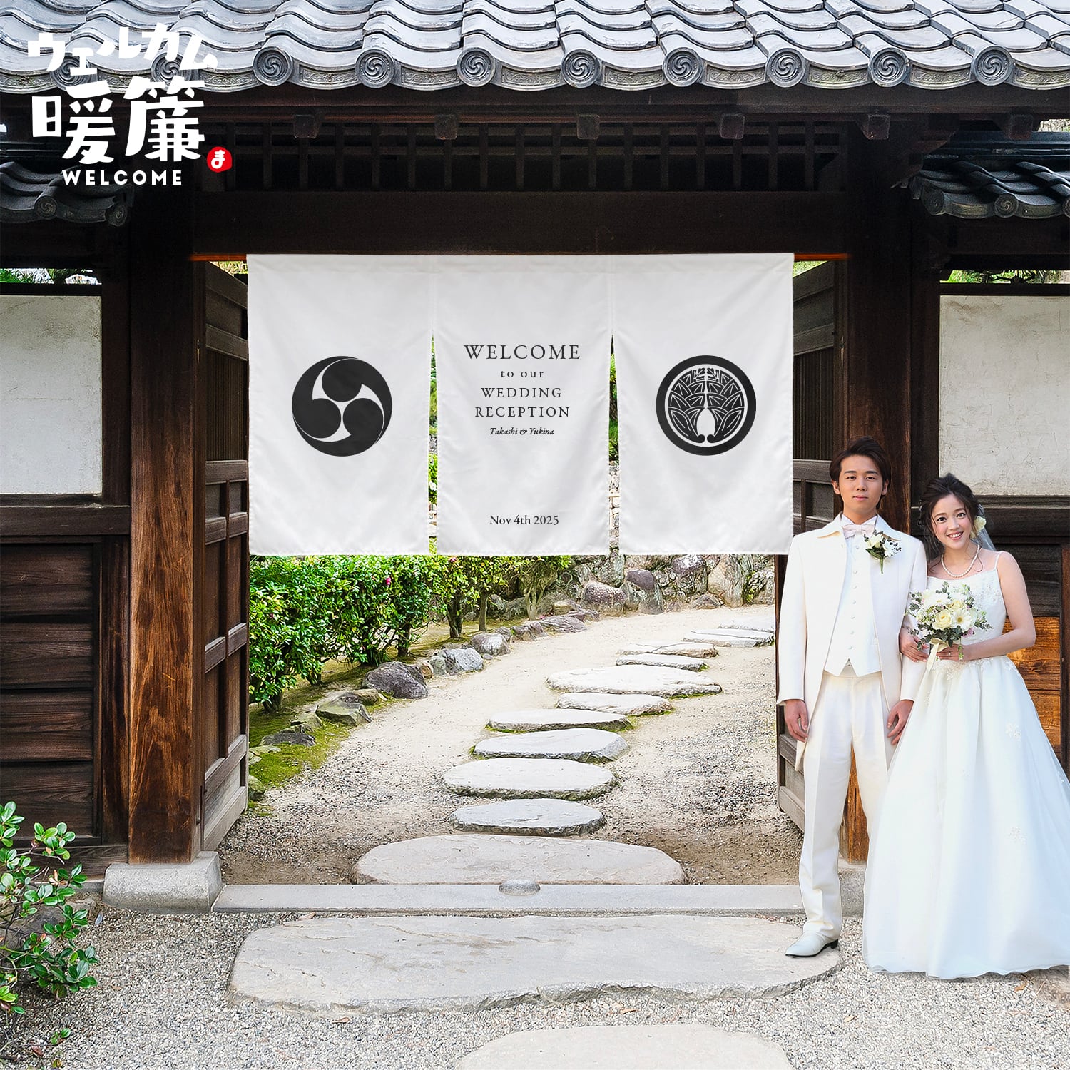 結婚式や前撮り、披露宴の受付・エントランスを華やかに演出する「ウェルカム暖簾」です。